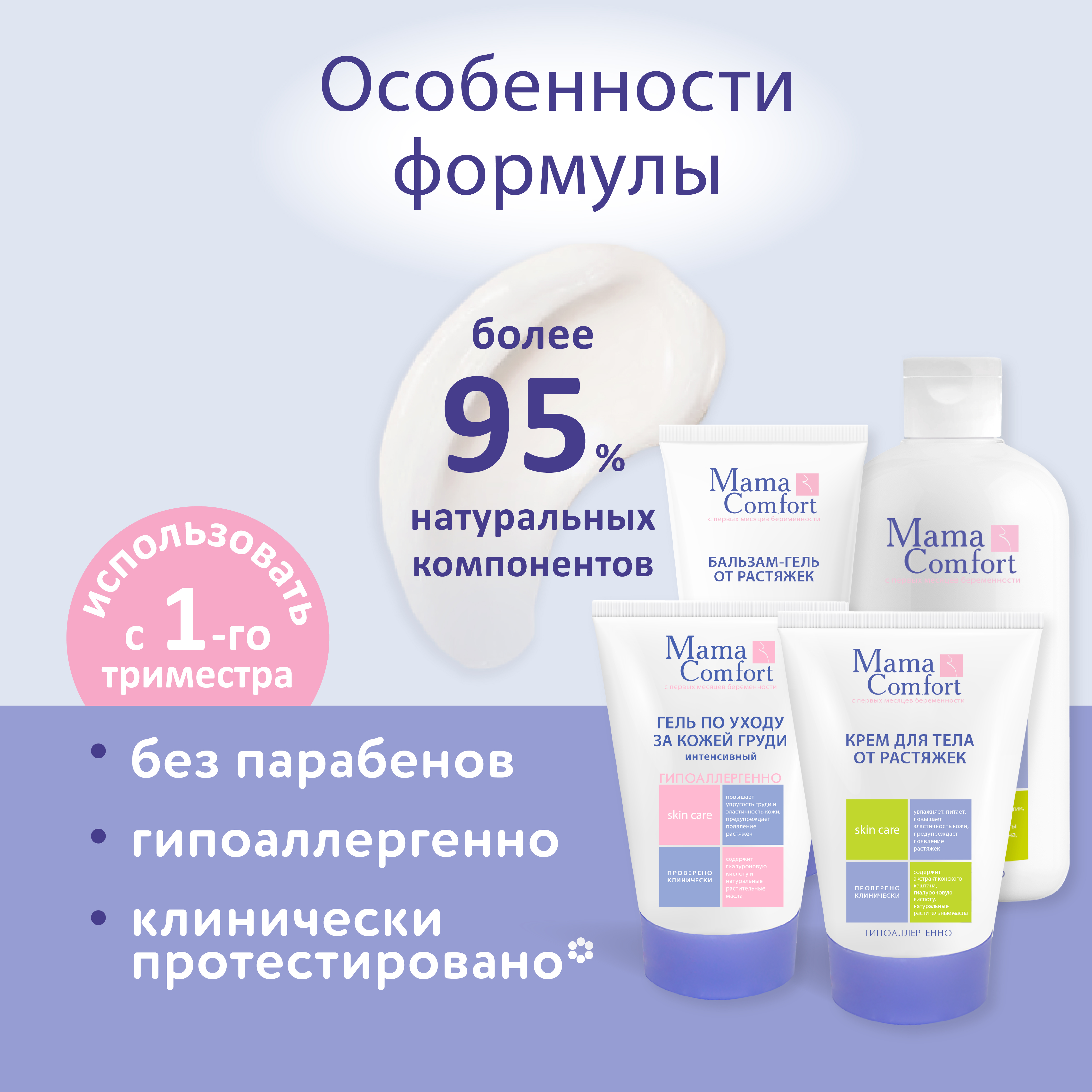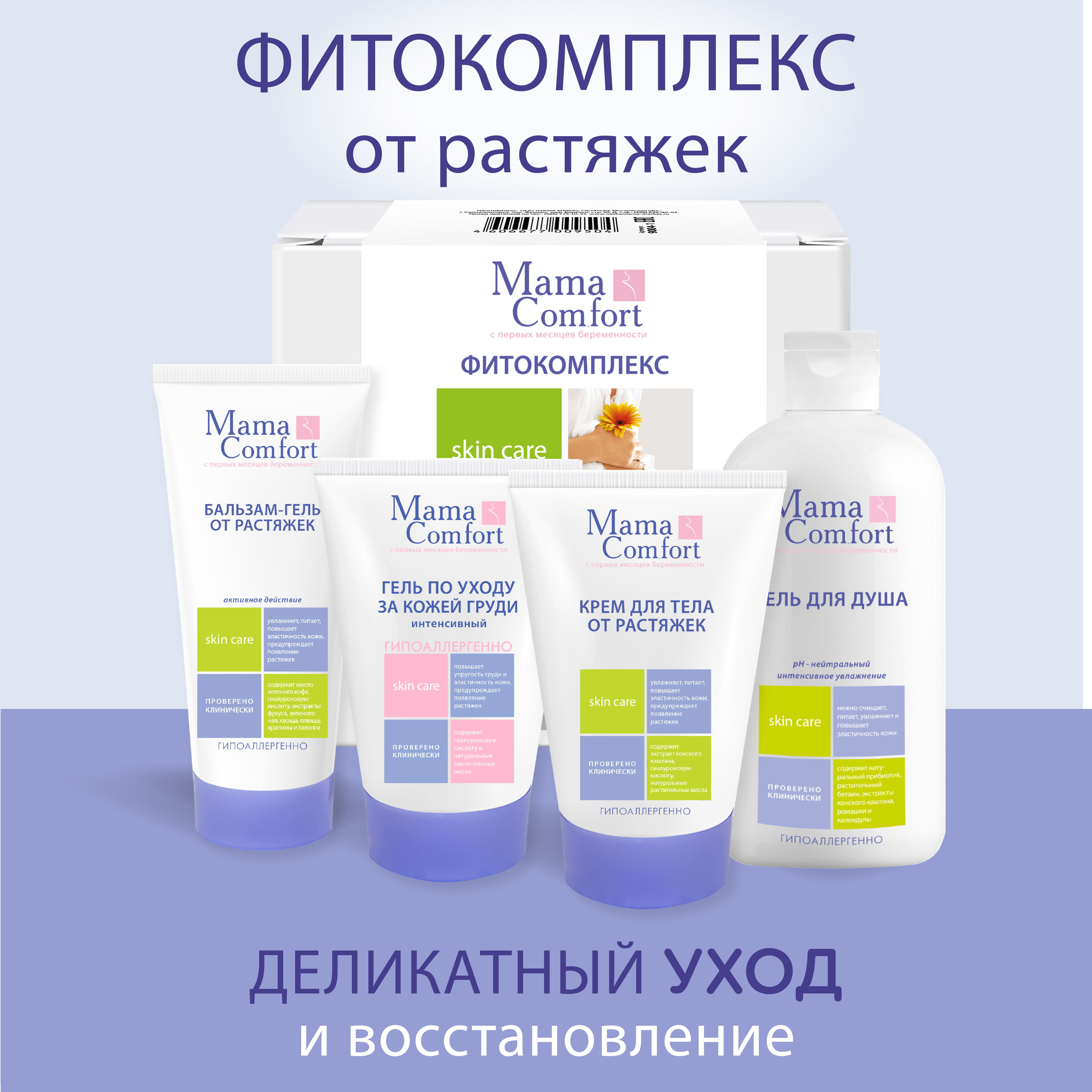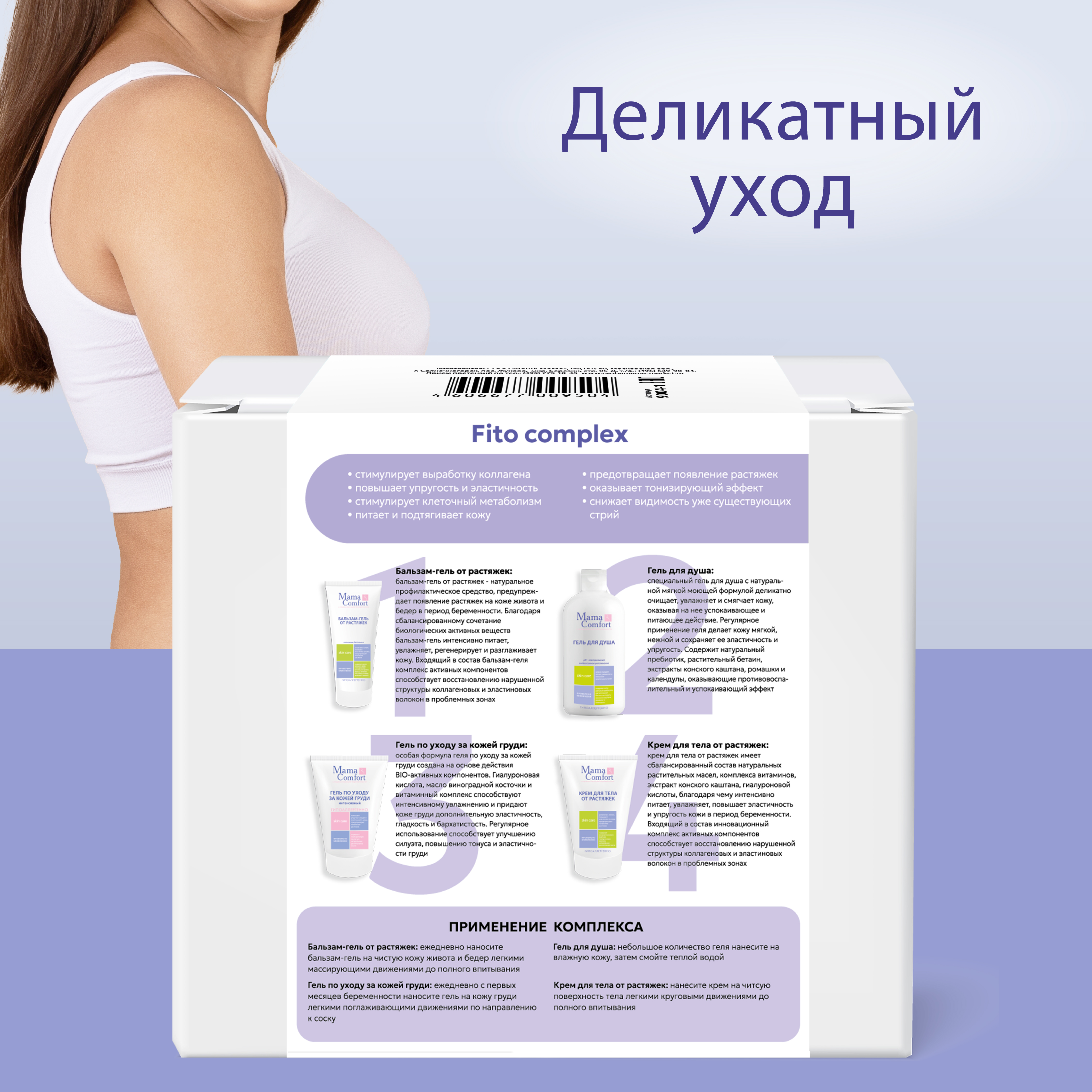 Натуральный гипоаллергенный фитокомплекс от растяжек серии "Mama Com.fort" включает в себя четыре средства: