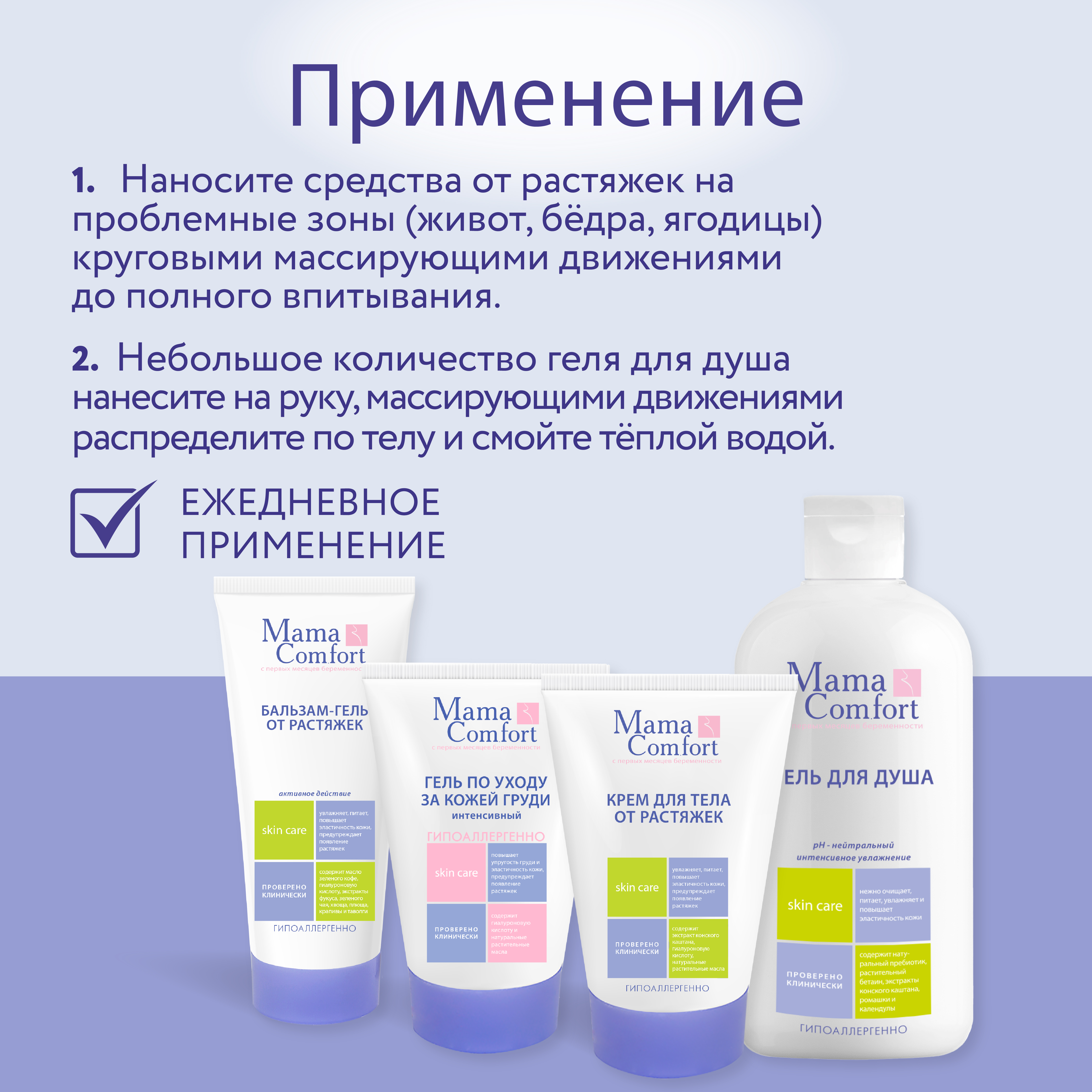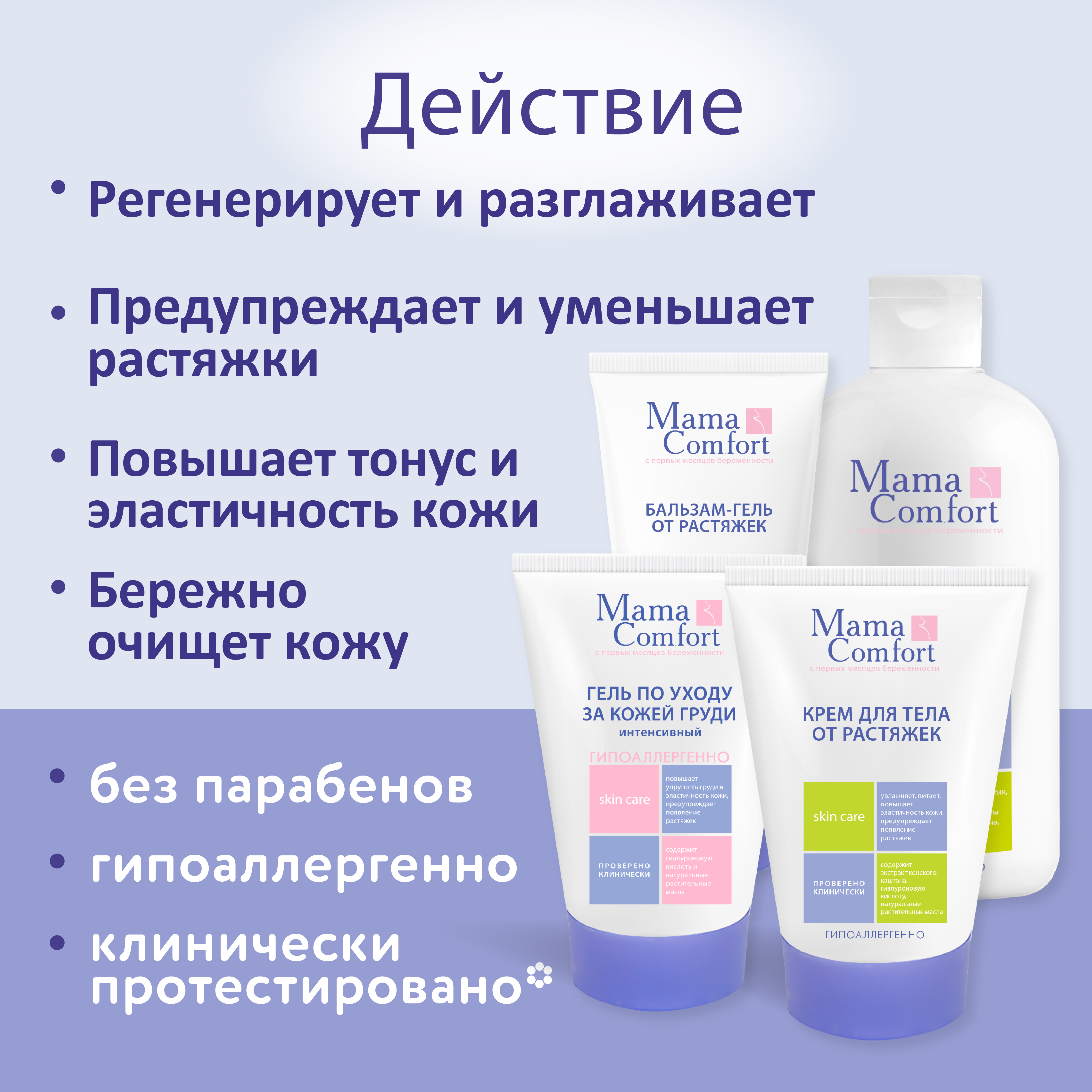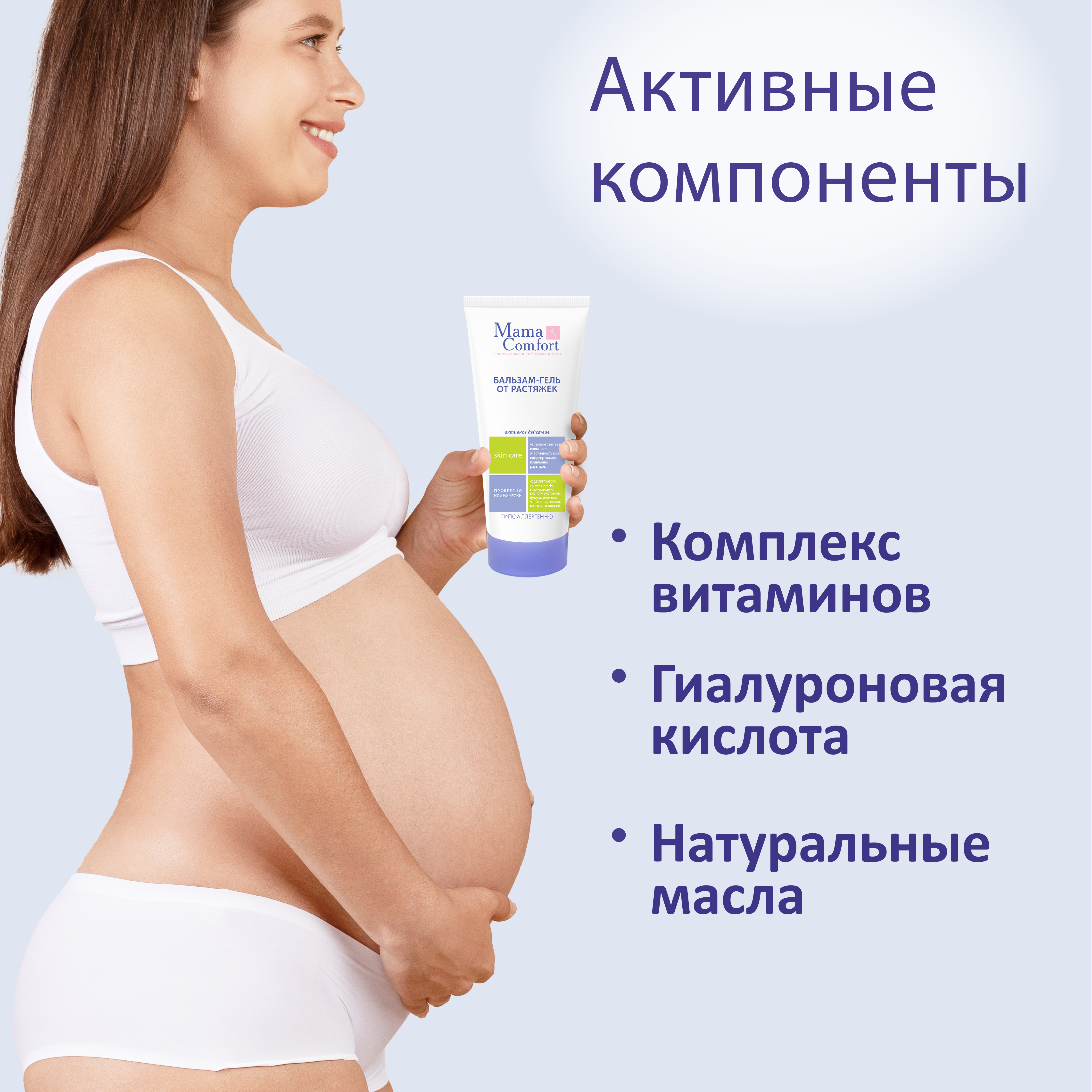 Натуральный гипоаллергенный фитокомплекс от растяжек серии "Mama Com.fort" включает в себя четыре средства: