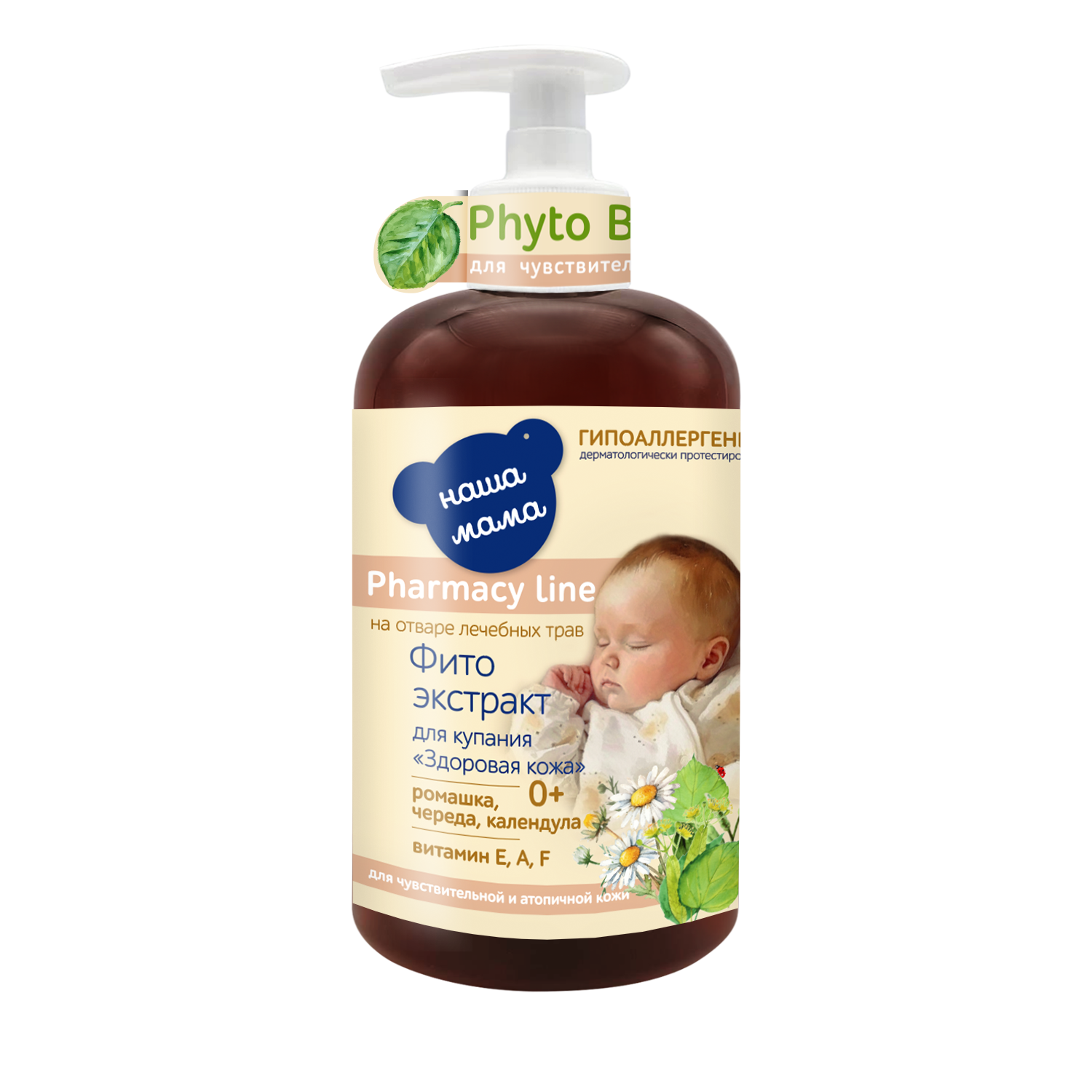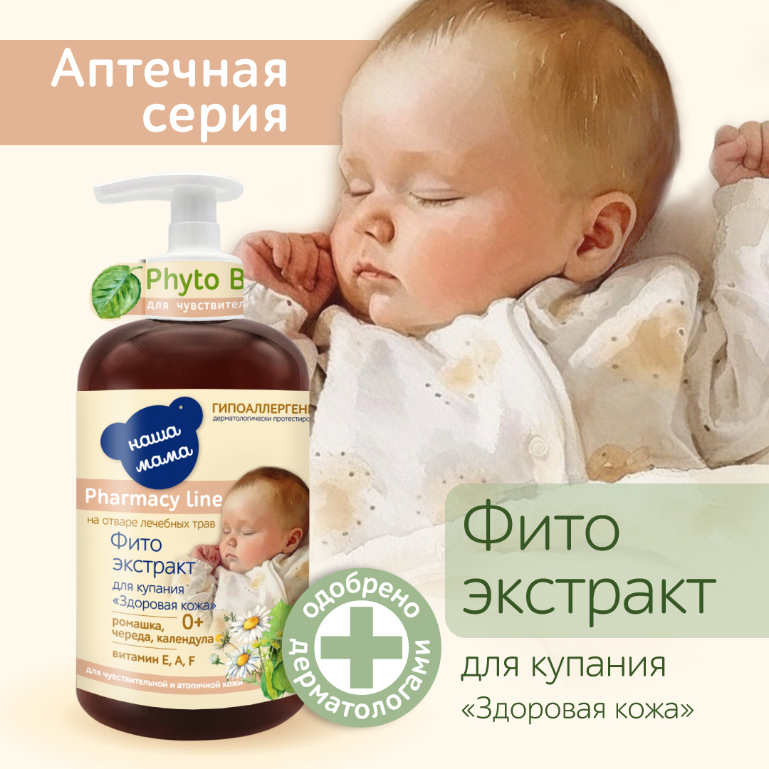 Детский фито-экстракт для купания "Здоровая кожа" "Наша мама" серии "Fito Baby", подходит малышам с чувствительной и проблемной кожей с самого рождения. Благодаря технологии позволяющей сохранить все полезные свойства лечебных трав и растений - ромашки, календулы, череды, липы и тысячелистника, входящих в состав и дополнительному обогащению экстракта витаминами Е, А и F, фито-экстракт бережно очищает кожу ребенка, снимает сухость и раздражение, способствует питанию и увлажнению кожи, оказывает противовоспалительное действие, он более эффективен для купания в первые месяцы жизни малышей, чем другие средства. Фито-экстракт гипоаллергенен и рекомендован для ежедневных гигиенических процедур у детей.