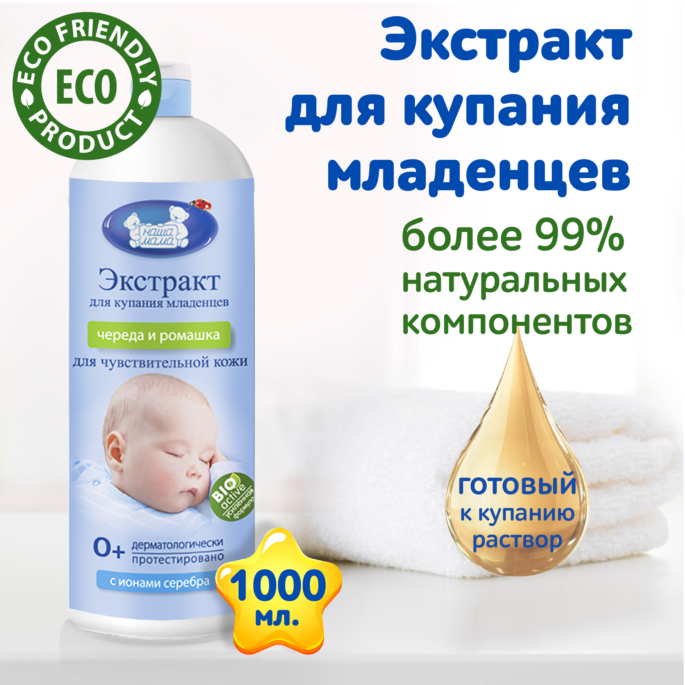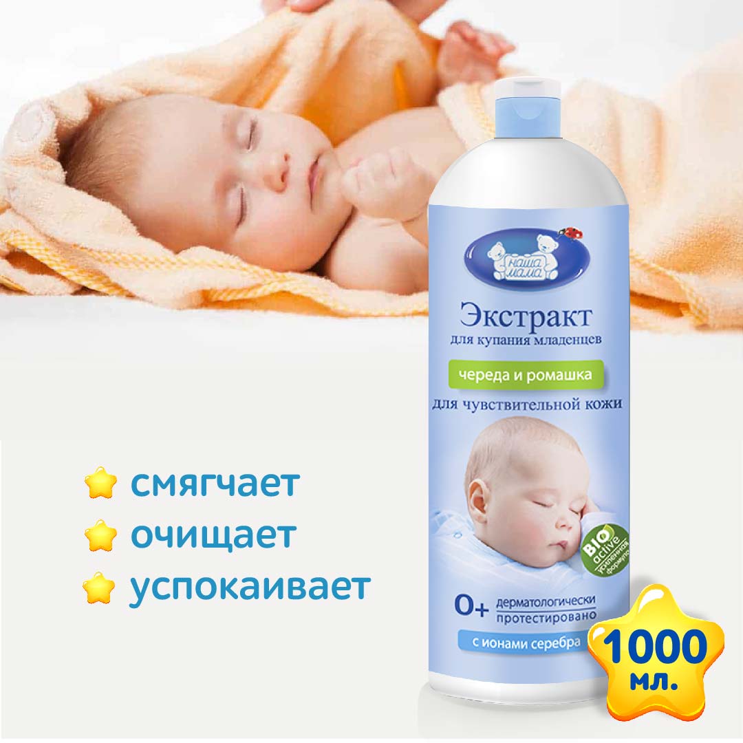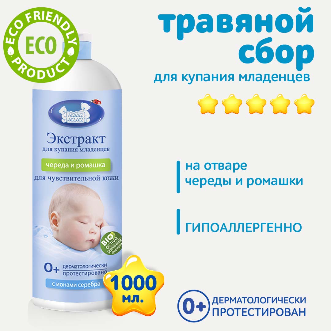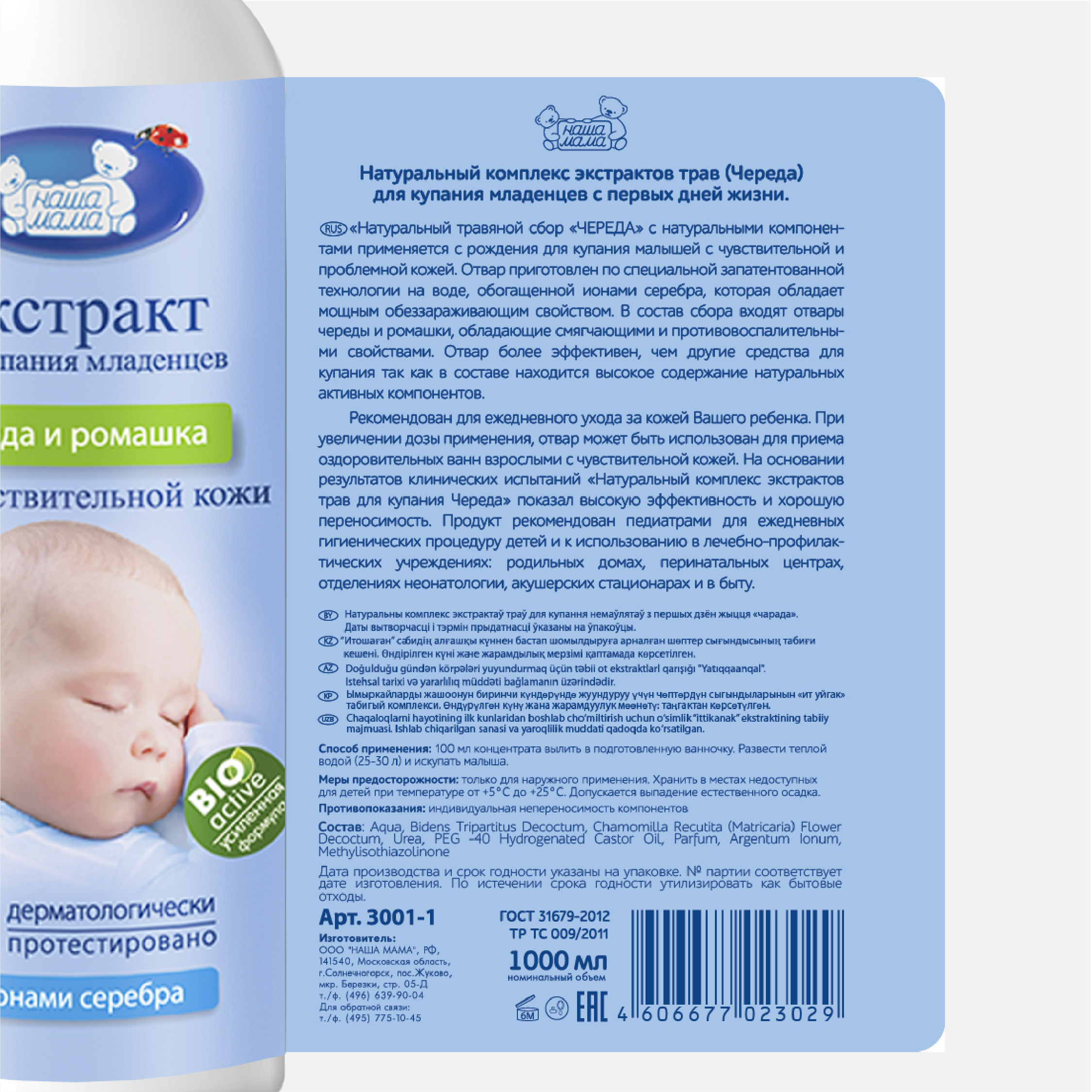 Натуральный комплекс экстрактов трав "ЧЕРЕДА" с натуральными компонентами для купания младенцев с первых дней жизни серии "Наша мама" применяется с рождения для купания малышей с чувствительной и проблемной кожи. Комплекс приготовлен по специальной запатентованной технологии на воде обогащенной ионами серебра, которая обладает мощным обеззараживающим свойством. В состав сбора входят отвары череды и ромашки, обладающие смягчающими и противовоспалительными свойствами. Комплекс более эффективен чем другие средства для купания т.к. в составе находиться высокое содержание натуральных активных компонентов. Комплекс рекомендован для ежедневного ухода за кожей ребенка. При увеличении дозы применения, отвар может быть использован для приема оздоровительных ванн взрослыми с чувствительной кожей. На основании результатов клинических испытаний "Натуральный комплекс экстрактов трав "ЧЕРЕДА" для купания младенцев с первых дней жизни" показал высокую эффективность и хорошую переносимость, рекомендован педиатрами для ежедневных гигиенических процедур у детей и к использованию в лечебно-профилактических учреждениях: родильных домах, перинатальных центрах, отделениях неонатологии, акушерских стационарах и в быту.